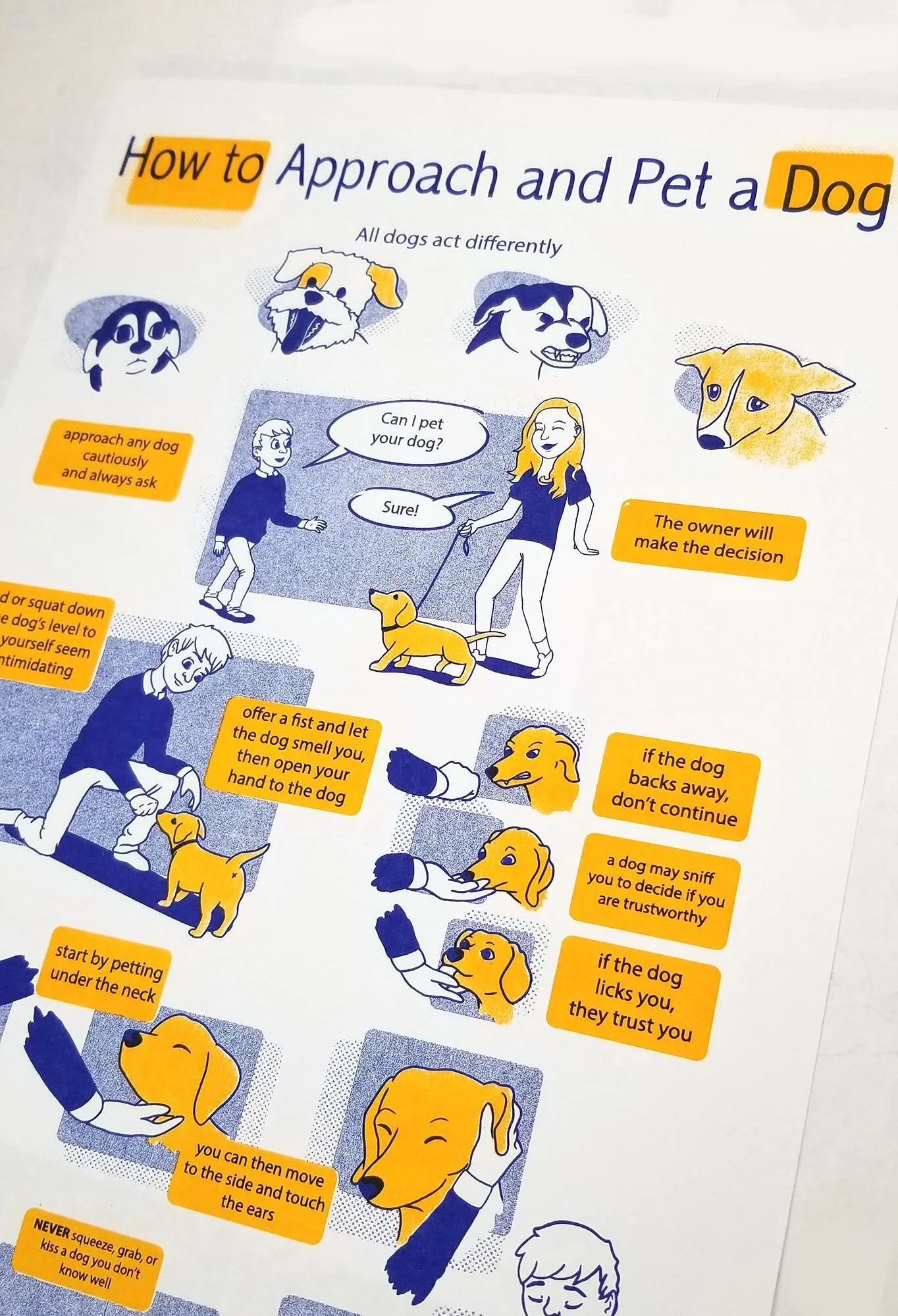 Comic-based poster designed for use in pet shops, animal adoption centers, and educational spaces to direct people young and old on the correct ways to approach an unknown dog.